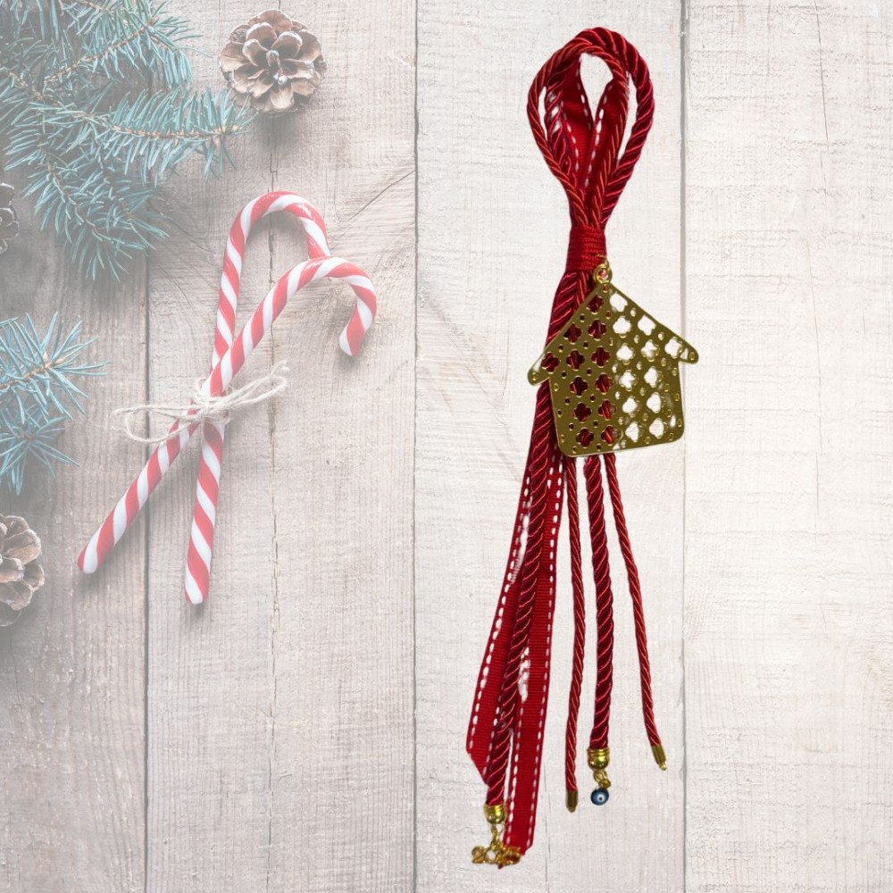 Γούρι με χρυσό σπιτάκι σε διάτρητο σχέδιο και κόκκινες λεπτομέρειες. Συμβολίζει την οικογενειακή θαλπωρή και προστασία, συνδυάζοντας παραδοσιακά στοιχεία με μοντέρνα σχεδίαση, ιδανικό για πρωτοχρονιάτικο δώρο.