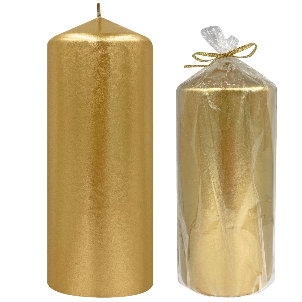 Κερί κολώνα σε μεταλλικό χρυσό χρώμα με γυαλιστερό φινίρισμα. Κυλινδρικό σχήμα, ιδανικό για εορταστική διακόσμηση και ατμόσφαιρα. Συσκευασμένο σε διάφανη σελοφάν με χρυσή κορδέλα, κατάλληλο για δώρο. Προσθέτει πολυτελή και κομψή πινελιά σε χριστουγεννιάτικες ή εορταστικές διακοσμήσεις.