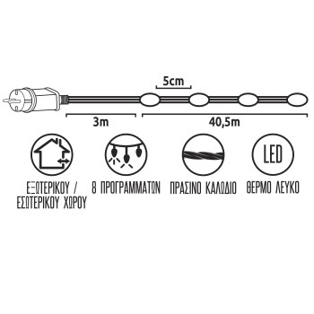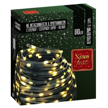 Φωτάκια LED με 810 λαμπτήρες σε λευκό θερμό χρώμα και πράσινο καλώδιο. Διαθέτουν μετασχηματιστή με 8 προγράμματα φωτισμού για ποικίλα εφέ. Κατάλληλα για εσωτερικό και εξωτερικό χώρο. Ιδανικά για εντυπωσιακή χριστουγεννιάτικη διακόσμηση δέντρων, χώρων και εξωτερικών περιοχών.