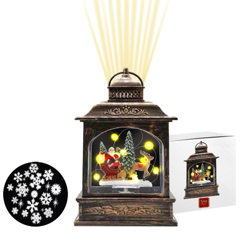 Διακοσμητικό χριστουγεννιάτικο φανάρι σε vintage bronze στυλ με φωτιζόμενη σκηνή Άγιου Βασίλη, ελαφιού και δέντρων. Εσωτερικά LED φωτάκια και προβολέας νιφάδων χιονιού στην οροφή. Ανάγλυφες λεπτομέρειες και λαβή μεταφοράς. Δημιουργεί μαγική, νοσταλγική χριστουγεννιάτικη ατμόσφαιρα με εφέ χιονοπτώσεων. Ιδανικό για εσωτερική διακόσμηση.