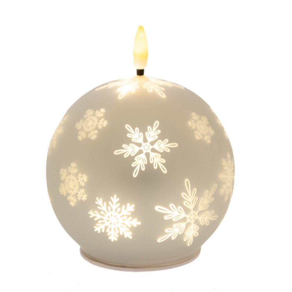 Διακοσμητική σφαιρική μπάλα σε μορφή κεριού με χειμωνιάτικα μοτίβα νιφάδων χιονιού που φωτίζονται όταν ανάβει. Η λαμπερή ασημί απόχρωση και τα ανάγλυφα σχέδια δημιουργούν μαγευτική ατμόσφαιρα. Ιδανικό για χριστουγεννιάτικη διακόσμηση, ρομαντικά βράδια και εορταστικές εκδηλώσεις. Κομψό και λειτουργικό διακοσμητικό φωτισμού.