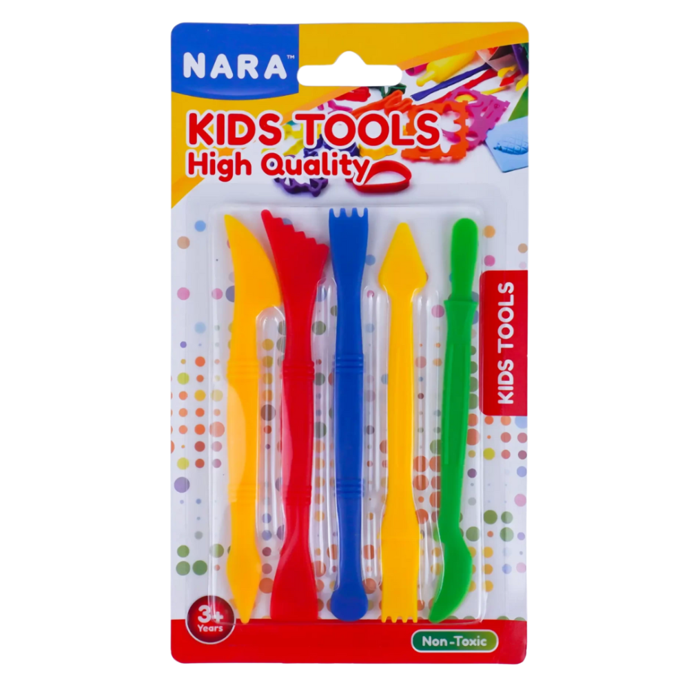 Σετ πλαστικών εργαλείων τέχνης NARA Kids Tools υψηλής ποιότητας για παιδιά. Περιλαμβάνει πέντε χρωματιστά εργαλεία διαμόρφωσης με διαφορετικές άκρες για δημιουργικές δραστηριότητες. Μη τοξικά και ασφαλή για παιδιά άνω των τριών ετών, ιδανικά για χρήση με πλαστελίνη και άλλα υλικά τέχνης.