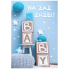 Ευχετήρια κάρτα για νεογέννητο αγοράκι με σύγχρονο σχεδιασμό. Ξύλινοι κύβοι με γράμματα "BABY" σε στυλ nursery, γαλάζια χάρτινα φαναράκια, πλεκτά διακοσμητικά, λευκές πεταλούδες και confetti κουκκίδες. Ελληνική ευχή "ΝΑ ΣΑΣ ΖΗΣΕΙ!" σε 3D λευκά γράμματα. Φωτογραφικά ρεαλιστικό, σύγχρονο και τρυφερό.