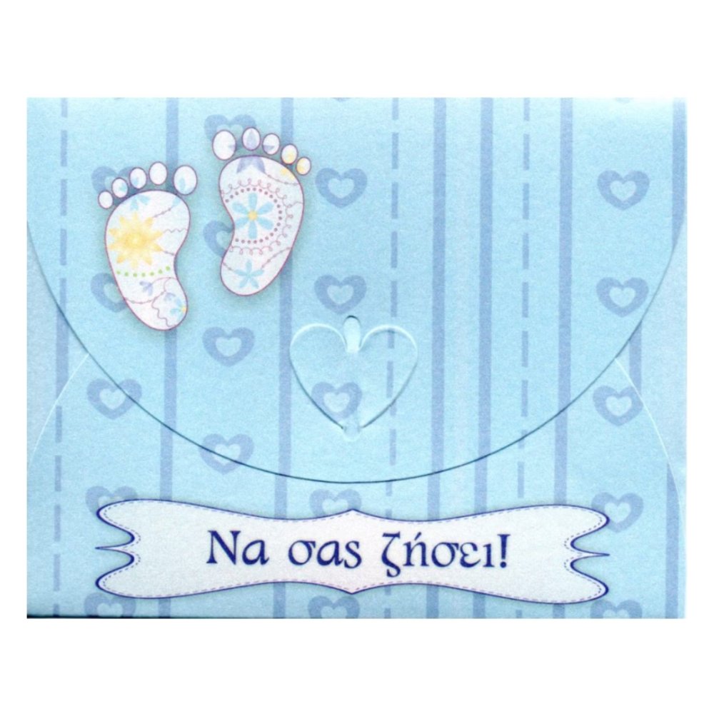 Ευχετήρια κάρτα για νεογέννητο αγοράκι σε γαλάζιο ριγέ φόντο. Δύο διακοσμητικά πατουσάκια μωρού με floral μοτίβα στην κορυφή, περιτριγυρισμένα από απαλές καρδούλες. Κάτω, λευκή κορδέλα με την ελληνική ευχή "Να σας ζήσει!". Γλυκό, τρυφερό σχέδιο για γέννηση μωρού.