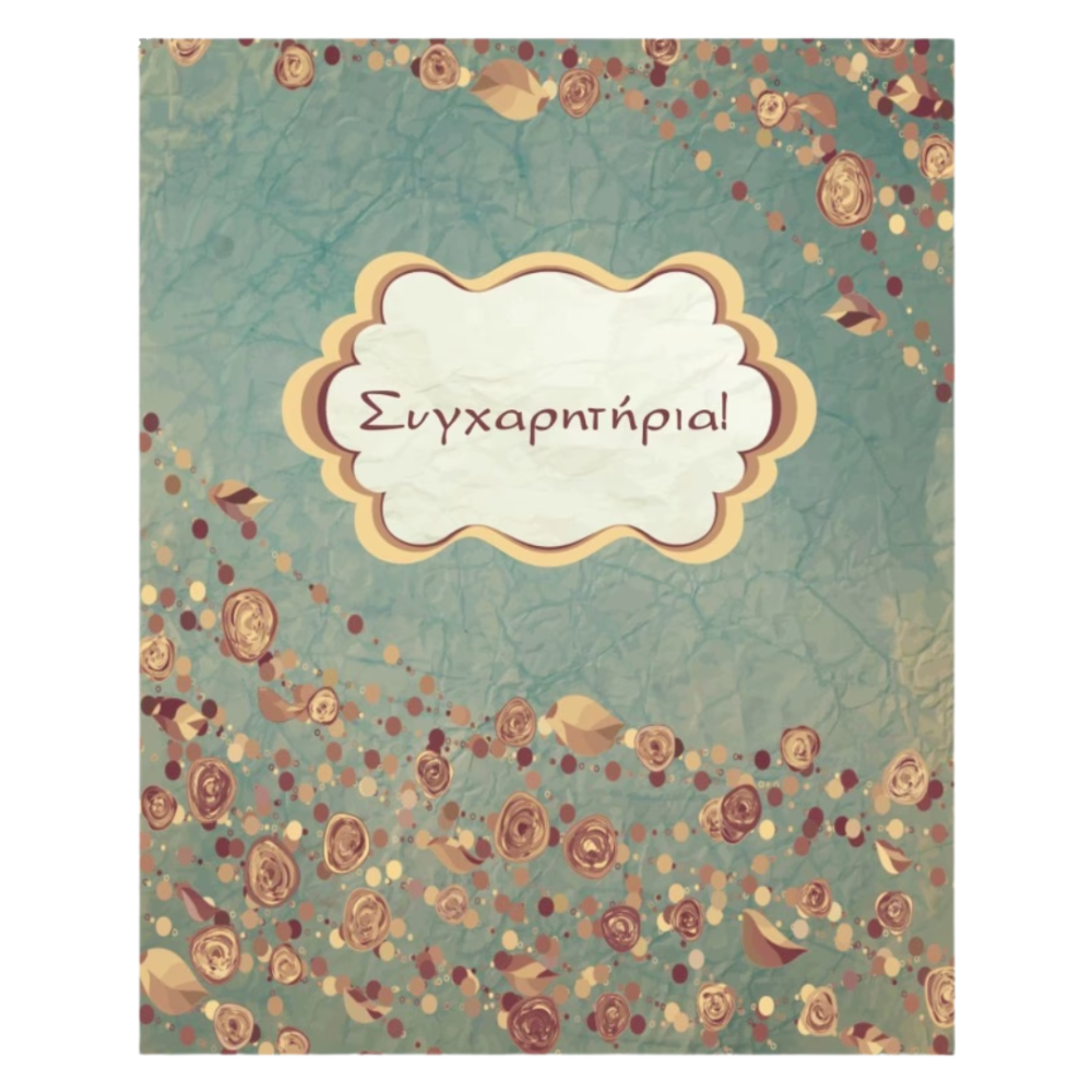 Ευχετήρια κάρτα με vintage αισθητική σε πετρόλ φόντο με υφή τσαλακωμένου χαρτιού. Floral διακόσμηση με τριαντάφυλλα, φύλλα και πουλιά σε γήινους τόνους. Κεντρικό διακοσμητικό πλαίσιο με την ελληνική λέξη "Συγχαρητήρια!". Shabby chic στυλ, κομψό και νοσταλγικό. Κατάλληλο για πολλαπλές περιστάσεις.