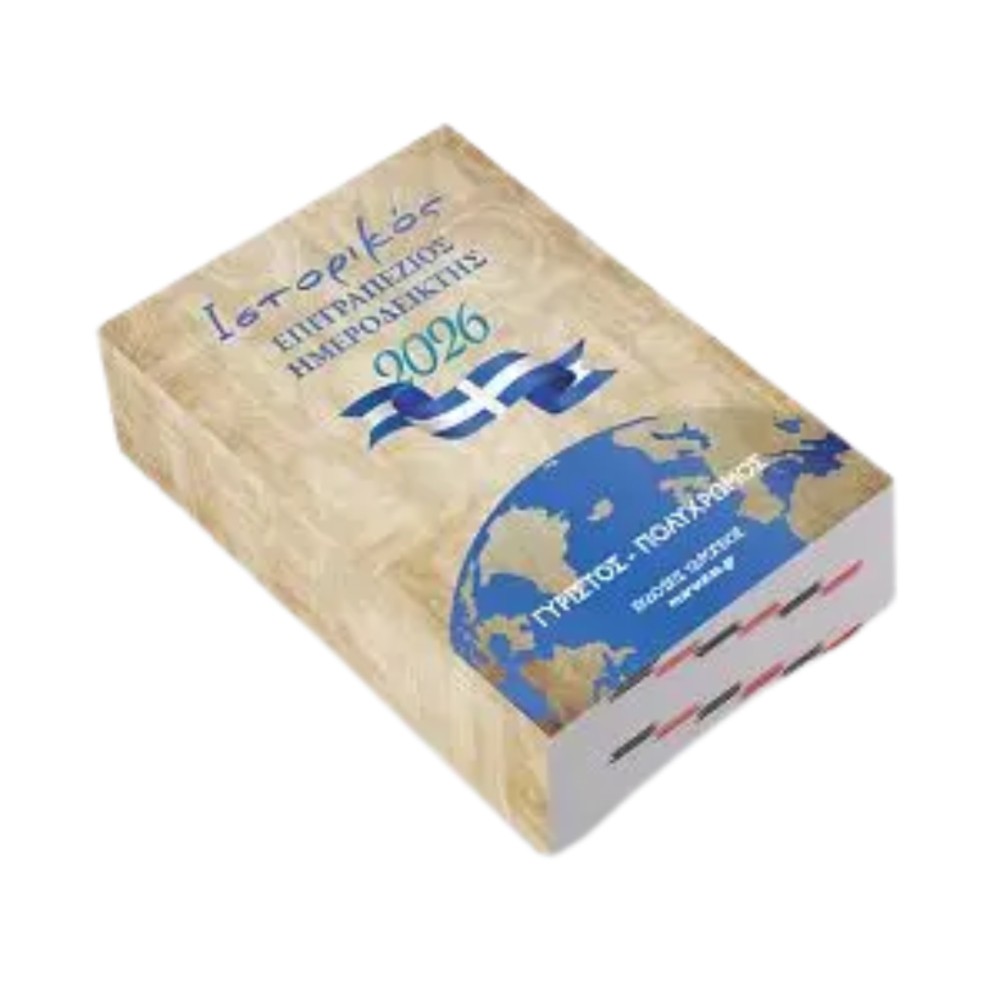 Το Ημερολόγιο Ημερήσιο Γυριστό προσφέρει καθημερινή πλοήγηση στο χρόνο με ελληνικό χαρακτήρα. Διαθέτει εξώφυλλο με την ελληνική σημαία και παγκόσμιο χάρτη σε vintage στυλ, συνδυάζοντας λειτουργικότητα στο γραφείο σας και την εργασία σας.