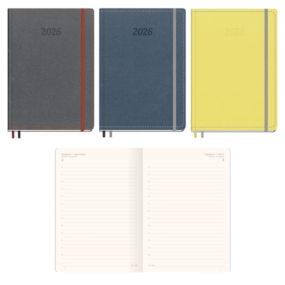 Ημερολόγιο 2026 με σύγχρονο σχεδιασμό και διακοσμητικά ράμματα. Δυναμικές επιλογές - γκρι, μπλε και κίτρινο - με χρωματιστά ελαστικά και διπλούς σελιδοδείκτες. Εσωτερικά προσφέρει ημερήσια ωριαία διάταξη σε δίγλωσση μορφή. Ιδανικό για λεπτομερή προγραμματισμό και επαγγελματική χρήση με στυλ.