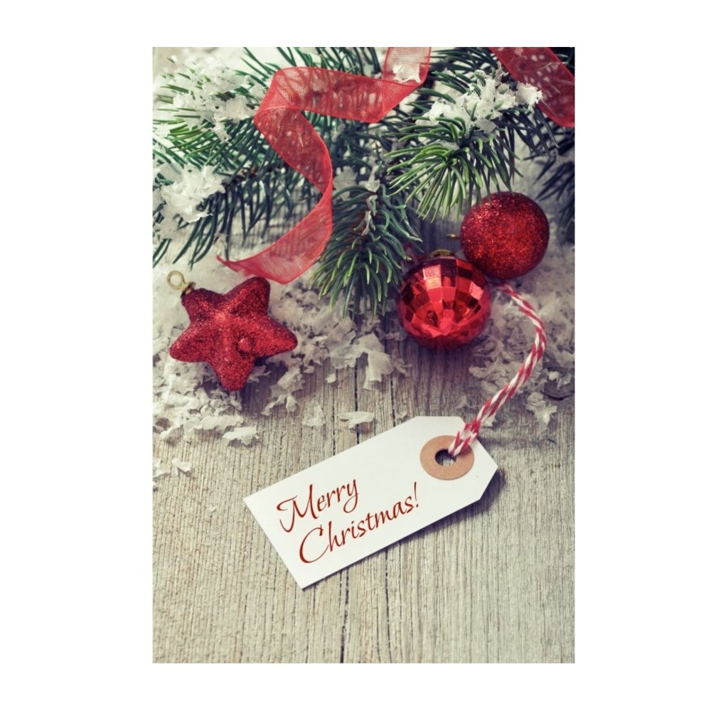Εορταστική κάρτα απεικονίζει γιορτινή σύνθεση με κόκκινα χριστουγεννιάτικα στολίδια από γυαλί - ένα αστέρι και δύο μπάλες - δίπλα σε πράσινα κλαδιά ελάτου και μια λευκή ετικέτα που γράφει "Merry Christmas!" με κόκκινη κορδέλα.