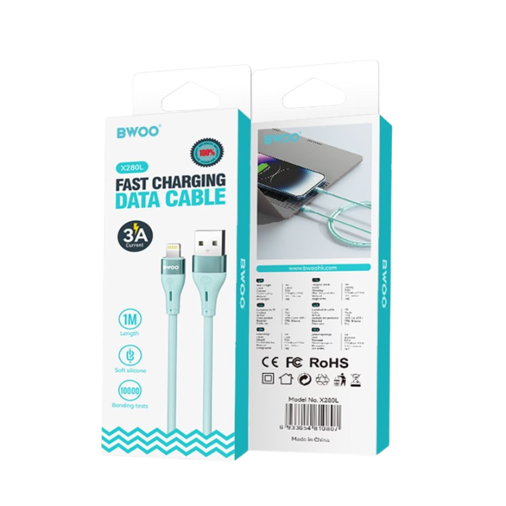 Καλώδιο γρήγορης φόρτισης BWOO X280L με Lightning υποδοχή για συσκευές Apple. Κατασκευασμένο από μαλακή σιλικόνη σε ελκυστικό τιρκουάζ χρώμα, προσφέρει υψηλή αντοχή με 10.000 δοκιμές κάμψης. Υποστηρίζει φόρτιση 3A για γρήγορη ενεργοποίηση και συγχρονισμό δεδομένων με απόλυτη ασφάλεια και αξιοπιστία.