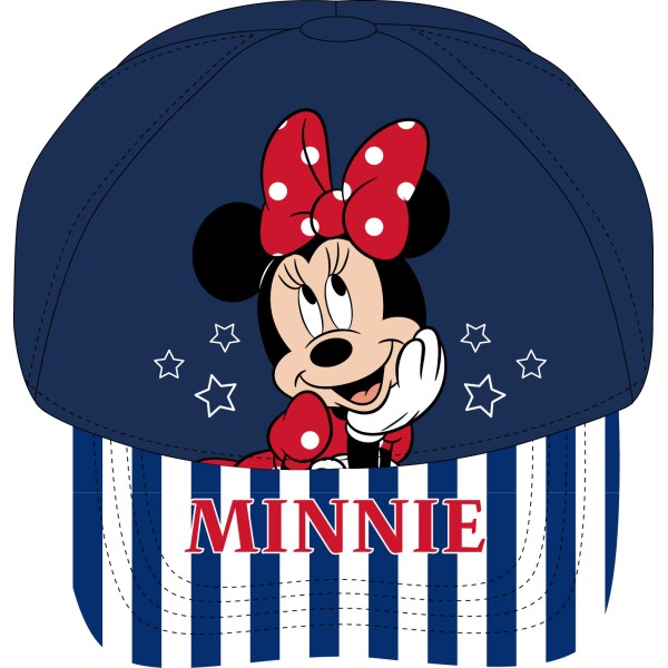 Παιδικό καπέλο τζόκεϊ Disney Minnie Mouse σε μπλε ναυτικό στυλ συνδυάζει παιχνιδιάρικη διάθεση και προστασία από τον ήλιο. Με τον αγαπημένο χαρακτήρα της Minnie στο μπροστινό μέρος, τον χαρακτηριστικό κόκκινο φιόγκο με λευκά πουά, και διακοσμητικά αστέρια, το γείσο με μπλε-λευκές ριγέ ναυτικού τύπου, αποτελεί την ιδανική επιλογή για καλοκαιρινές βόλτες και εξορμήσεις.