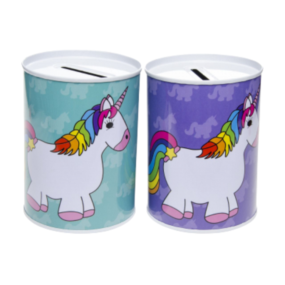 Μεταλλικός κουμπαράς με χαριτωμένο σχέδιο μονόκερου και πολύχρωμη χαίτη ουράνιου τόξου. Διαθέσιμος σε τιρκουάζ και μωβ χρώμα με παστέλ φόντο. Ιδανικός για παιδιά που αγαπούν τους μονόκερους και τα μαγικά πλάσματα. Πρακτικός τρόπος αποταμίευσης με φαντασία και χαρά.