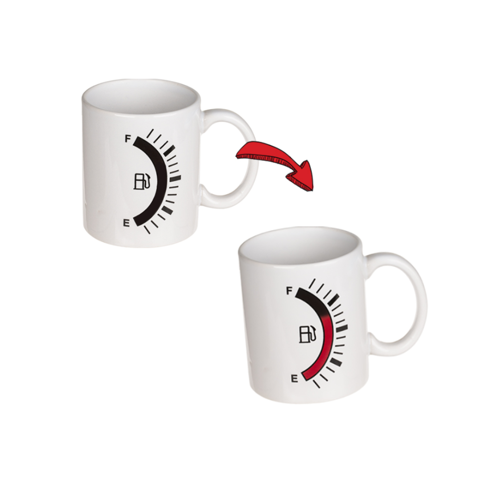 Έξυπνη κούπα με θερμοευαίσθητο σχεδιασμό που προσομοιώνει δείκτη βενζίνης. Όταν είναι άδεια, ο δείκτης δείχνει "E" (Empty), αλλά μόλις γεμίσει με ζεστό ρόφημα, ο δείκτης ανεβαίνει στο "F" (Full)! Ιδανική για όσους χρειάζονται το καφέ τους ως καύσιμο για τη μέρα!