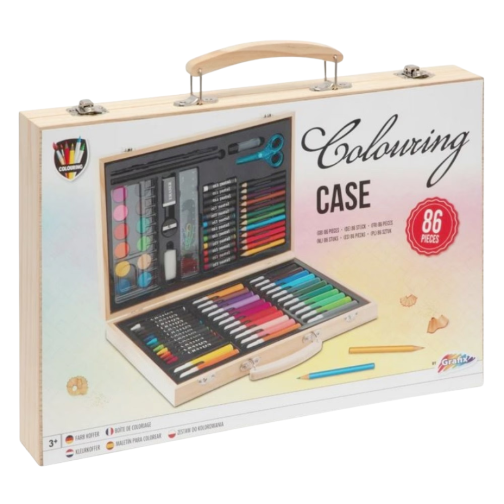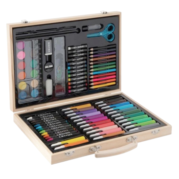 Ολοκληρωμένο καλλιτεχνικό σετ ζωγραφικής σε ξύλινη βαλίτσα με 86 τεμάχια. Περιλαμβάνει χρωματιστά ξυλομπογιές, κηρομπογιές, μαρκαδόρους, νερομπογιές και εξαρτήματα ζωγραφικής. Ιδανικό δώρο για παιδιά άνω των 3 ετών που αγαπούν τη δημιουργική έκφραση και τέχνη.