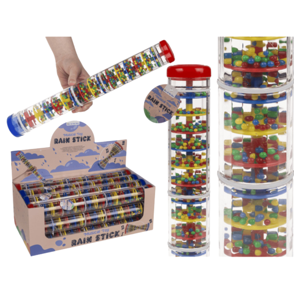 Ένα μαγικό μουσικό παιχνίδι "Rain Stick" που μιμείται τον ήχο της βροχής! Με πολύχρωμες χάντρες που πέφτουν μέσα από διαδρόμους, δημιουργεί χαλαρωτικούς ήχους. Διαφανές σωλήνα με μπλε καπάκια, ιδανικό για αισθητηριακή εξερεύνηση, μουσική εκπαίδευση και χαλάρωση.