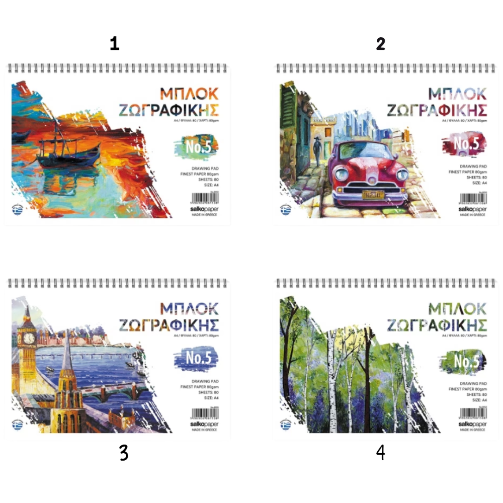 Μπλοκ ζωγραφικής A4 της Salko Paper με 80 φύλλα και χαρτί 80 γραμμαρίων. Διαθέσιμος σε τέσσερα διαφορετικά εξώφυλλα με καλλιτεχνικά σχέδια (πλοίο, αυτοκίνητο, Big Ben, δάσος). Ιδανικός για ζωγραφική, σκίτσα και καλλιτεχνικές δημιουργίες. Ελληνική παραγωγή υψηλής ποιότητας.