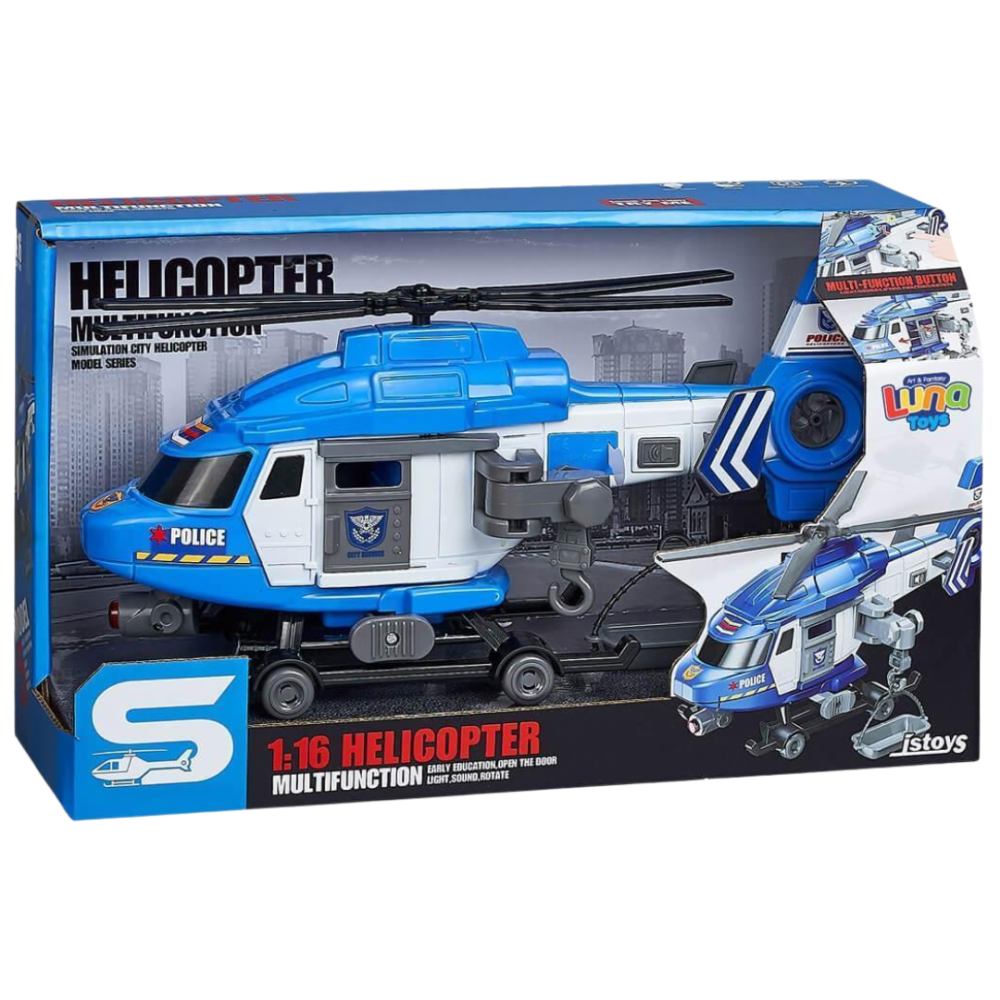 Εντυπωσιακό αστυνομικό ελικόπτερο σε κλίμακα 1:16 με πολλαπλές λειτουργίες. Διαθέτει φώτα, ήχους, περιστρεφόμενες έλικες και ανοιγόμενες πόρτες. Ρεαλιστική προσομοίωση αστυνομικού ελικοπτέρου πόλης για εκπαιδευτικό παιχνίδι. Αναπτύσσει φαντασία και δημιουργικότητα. Ιδανικό δώρο για μικρούς θαυμαστές της αστυνομίας.