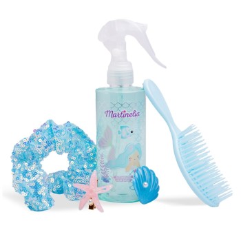 Περιλαμβάνει αποσμητικό σπρέι ξεμπερδέματος, βούρτσα, λαστιχάκι scrunchie με παγιέτες και 2 χαριτωμένα κλιπ μαλλιών σε σχέδια κοχυλιού και αστερία.