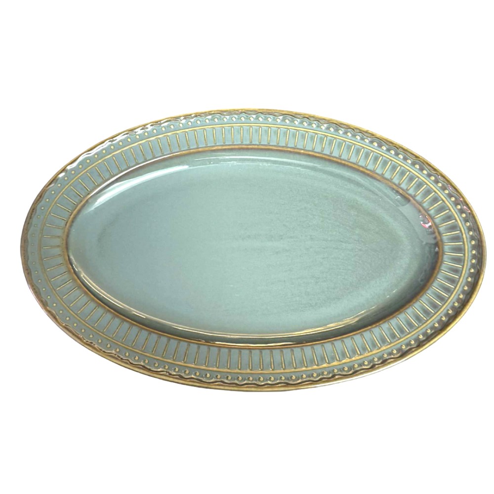 Εκλεπτυσμένη οβάλ πιατέλα σε απαλό γκρι- πράσινο χρώμα με περίτεχνες χρυσές λεπτομέρειες στο περίγραμμα. Το νεοκλασικό σχέδιο με γεωμετρικά μοτίβα και κουκίδες προσδίδει vintage κομψότητα. Ιδανική για εντυπωσιακό σερβίρισμα κρύων πιάτων ή γλυκών σε εορταστικά τραπέζια και δεξιώσεις.