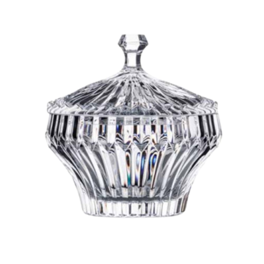 Κλασική γυάλινη φοντανιέρα με περίτεχνα ραβδωτό σχέδιο και διακοσμητικό καπάκι με ακτινωτά μοτίβα. Το γεωμετρικό πόμολο και οι κάθετες χαράξεις δημιουργούν εντυπωσιακά παιχνίδια φωτός. Ιδανική για αποθήκευση γλυκών, καραμελών, μπισκότων ή ως κομψό διακοσμητικό που προσθέτει vintage πολυτέλεια στο τραπέζι σας.