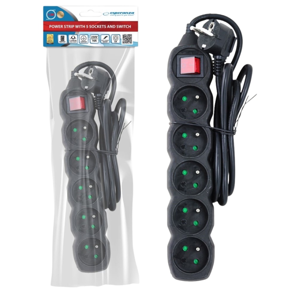 Πολύπριζο Esperanza με 5 θέσεις σε μαύρο χρώμα συνδυάζει λειτουργικότητα και στυλ. Προσφέρει ασφαλή τροφοδοσία για πολλαπλές συσκευές με φωτιζόμενο διακόπτη και πλήρη γείωση. Η ανθεκτική κατασκευή και το κομψό μαύρο χρώμα την καθιστούν ιδανική για κάθε χώρο.