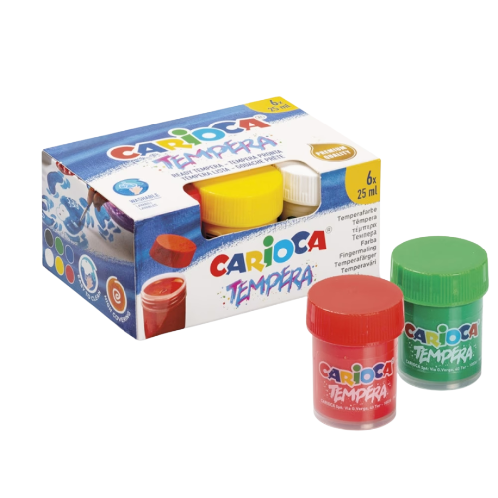 Το σετ τέμπερας Carioca περιλαμβάνει έξι έντονα χρώματα που πλένονται εύκολα. Ιδανικό για παιδική ζωγραφική και δημιουργικές δραστηριότητες στο σχολείο ή το σπίτι. Τα χρώματα έχουν πυκνή υφή, καλύπτουν άριστα και είναι ασφαλή για παιδιά.