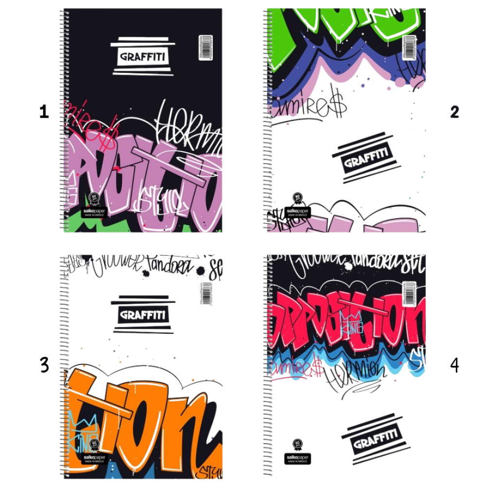 Τετράδιο σπιράλ "GRAFFITI" με urban street art αισθητική σε τέσσερα εντυπωσιακά σχέδια. Περιλαμβάνει αυθεντικά graffiti lettering, χρωματιστά tags και underground καλλιτεχνικά στοιχεία. Ιδανικό για νέους που αγαπούν την hip-hop κουλτούρα, το street art και τη σύγχρονη αστική αισθητική με έντονα χρώματα και δυναμικά σχέδια.