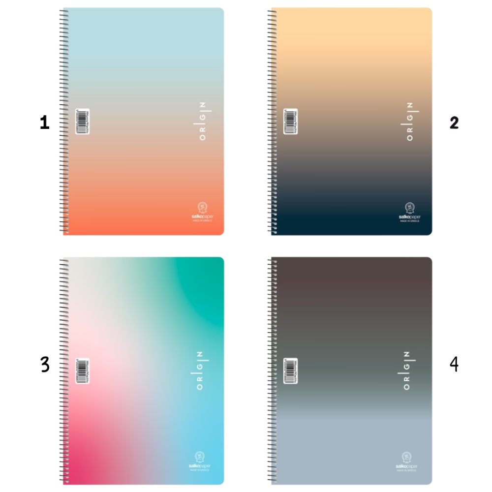 Τετράδιο σπιράλ Origin με 4 θέματα και gradient εξώφυλλο σε τέσσερις μοντέρνες χρωματικές παλέτες. Διαθέσιμο σε γαλάζιο-πορτοκαλί, πορτοκαλί-σκούρο μπλε, τυρκουάζ-κοραλλί και καφέ-γκρι. Ιδανικό για σπουδαστές, επαγγελματίες και όσους αγαπούν το μινιμαλιστικό σχεδιασμό με σύγχρονη αισθητική.
