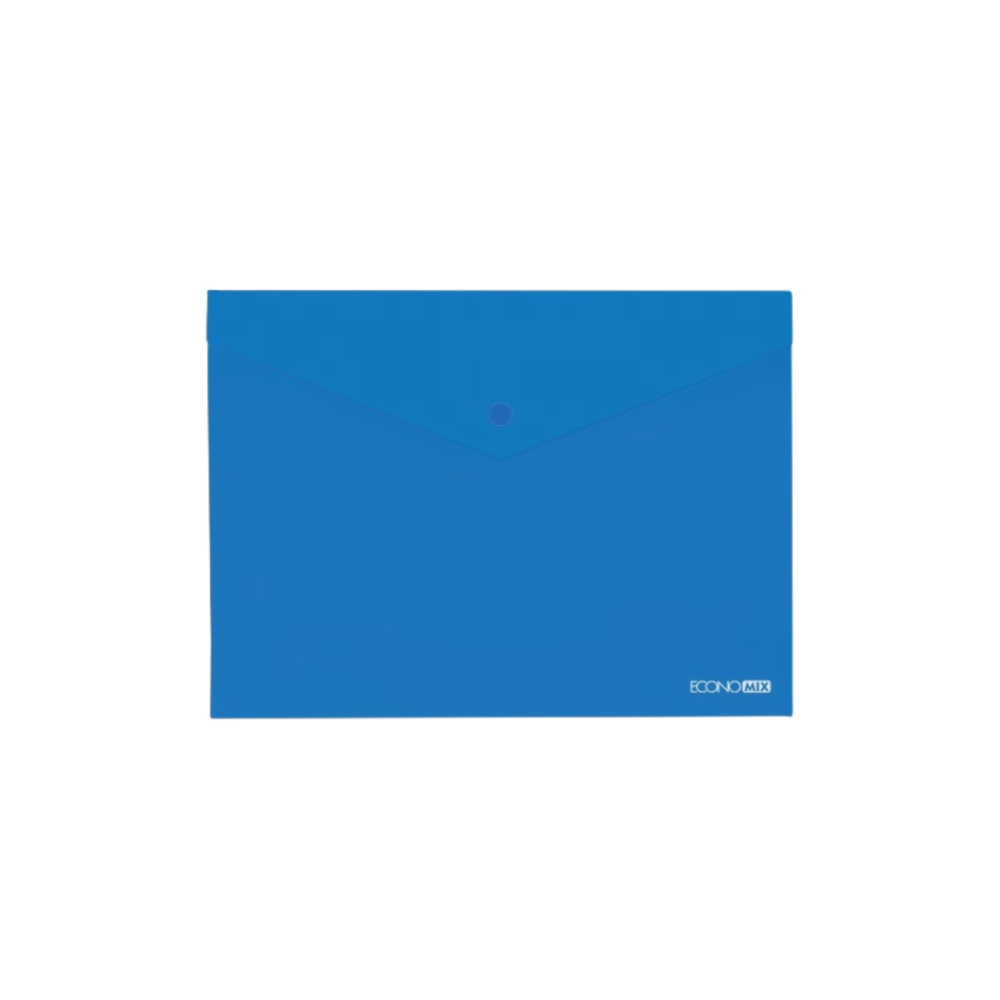 Φάκελος με κουμπί Economix, σε μπλε χρώμα, ιδανικός για την ασφαλή μεταφορά και αποθήκευση εγγράφων. Κατασκευασμένος από ανθεκτικό διαφανές πλαστικό, προσφέρει εύκολη πρόσβαση και προστασία των περιεχομένων από σκόνη και υγρασία.