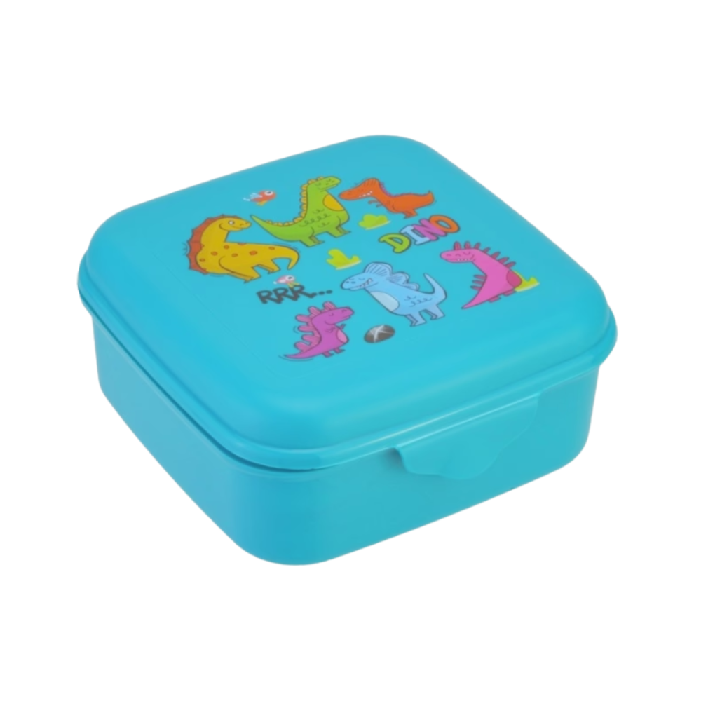 Παιδικό φαγητοδοχείο σε τυρκουάζ χρώμα με θέμα δεινοσαύρων και το σύνθημα "DINO". Διακοσμημένο με χαριτωμένους δεινοσαύρους σε ζωηρά χρώματα με ήχους "RRR". Ενιαίος χώρος χωρίς διαχωριστικά για απλή χρήση. Ασφαλές πλαστικό χωρίς BPA, ιδανικό για παιδιά που αγαπούν δεινοσαύρους.