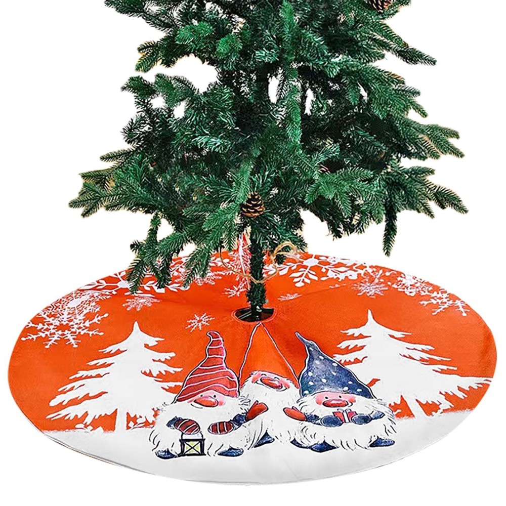 Χριστουγεννιάτικη ποδιά δέντρου σε πορτοκαλί-λευκό χρωματισμό με σχέδια ξωτικών, χιονισμένων δέντρων και νιφάδων χιονιού. Κυκλικό σχήμα με άνοιγμα για εύκολη τοποθέτηση γύρω από τη βάση του δέντρου. Προσθέτει χαρούμενη, ζεστή χριστουγεννιάτικη ατμόσφαιρα και καλύπτει αισθητικά τη βάση.